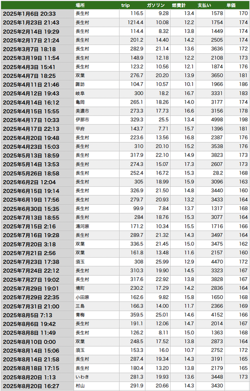 さて本題です。まずは1枚目の表を見てください。2025年の一部を例としてお見せしています。「場所」となっているのは給油したガソリンスタンドの所在地。「trip」は給油から給油までの走行距離。燃費は車両の平均燃費計の値です。ごく初期は満タン法で燃費を出していましたが、車の燃費計のほうが正確なようです。あとは支払いとガソリン単価ですが、2020年と2021年は記録がありません。