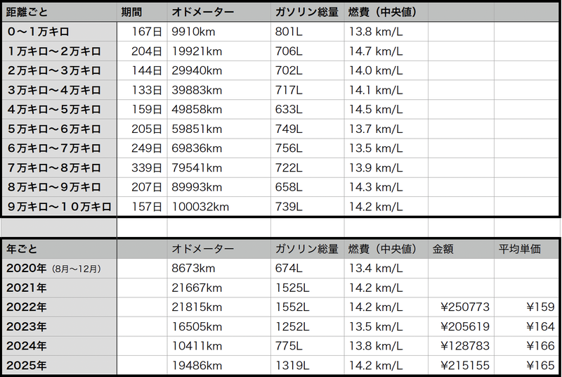 もう1枚、こちらの表では経年変化を見るために1万kmごと、年ごとにまとめてみました。