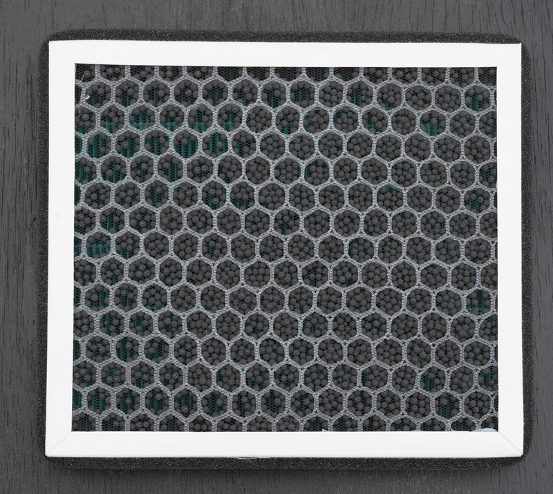 裏面が蜂の巣状の仕切りになってて、そこに活性炭の顆粒が入ってました。ニオイを吸収してくれるでしょうから、そこに期待。車の中っていろんなニオイがしてるはずなんだけど、ニオイって慣れちゃうんですよね。自分じゃわからないの。ごくたまに載せる同乗者への配慮ですかねえ、これでいくらか僕のおっさん臭も薄まるんではないかとシクシク。