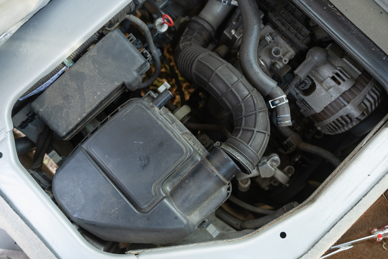 こっちもちゃっちゃと交換しちゃいましょう。これもエブリイ限定ですが、運転席をはね上げるとすぐにエアクリーナーボックスが見えます。ボックスの上下を止めるクリップが3カ所、これを外すだけでも交換できるようですが、僕はインテークパイプとブローバイパイプの両方を外しました。太いパイプと細いパイプね。