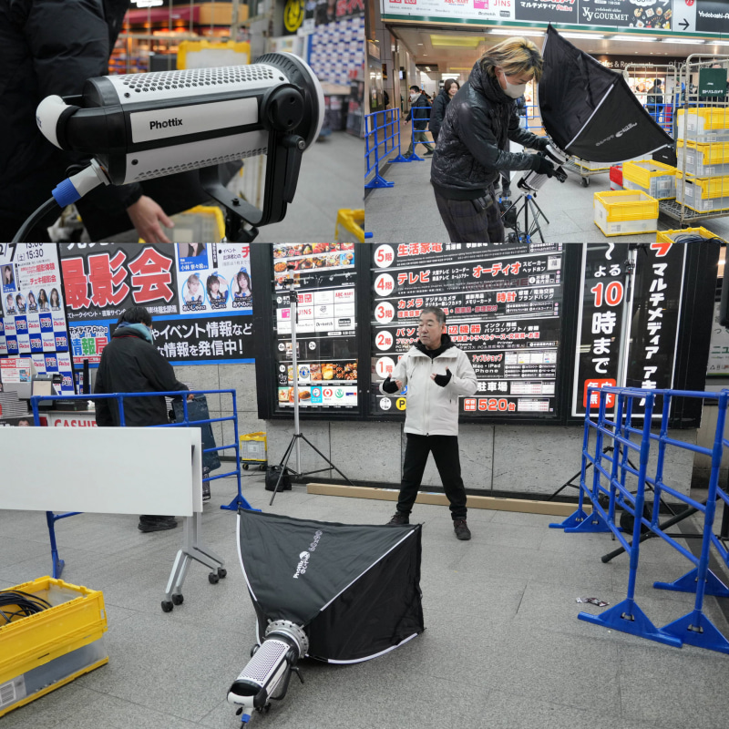 朝から撮影セットをこのように作った。参加者がそれぞれカメラを持参するのでストロボ撮影は非常に難しいため、ヨドバシカメラさんにLEDライトを手配していただき撮影することに。Phottix(フォティックス)X600 COB Daylight LED Lightにソフトボックス(Raja Quick-Folding Softbox)80×120cmと60×90cm。LEDライトとしては非常に光量が大きいので広い場所でも使えるものだ。