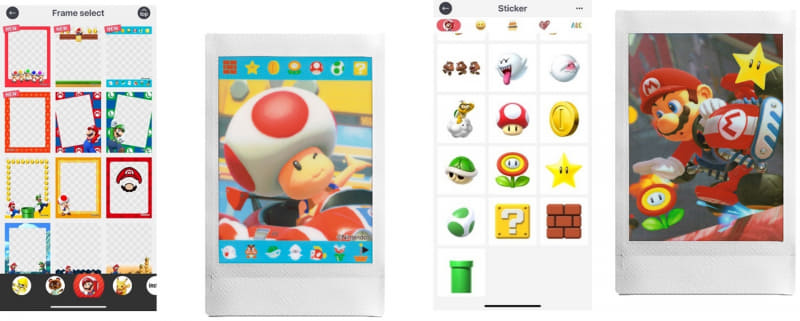 今回のアップデートは、任天堂株式会社との協業プロモーションの第3弾として実施。第1作「スーパーマリオブラザーズ」の発売から40周年を迎えた「スーパーマリオ」シリーズのキャラクターフレーム147点とステッカー167点が利用可能になり、撮影したゲーム画像などと組み合わせたプリントを作成できる。