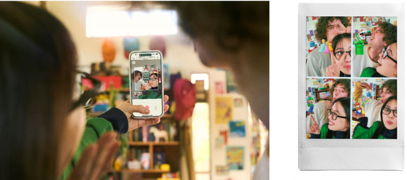 ランダムに登場する「スーパーマリオ」シリーズのキャラクターやアイテムと共に、カウントダウンに合わせて最大6枚まで撮影できる「Click to Collage」も加わった。作成したコラージュ画像をinstax mini Linkシリーズで出力すると、連続した画像を動きのある映像として再生する「instax Animation」も楽しめる。