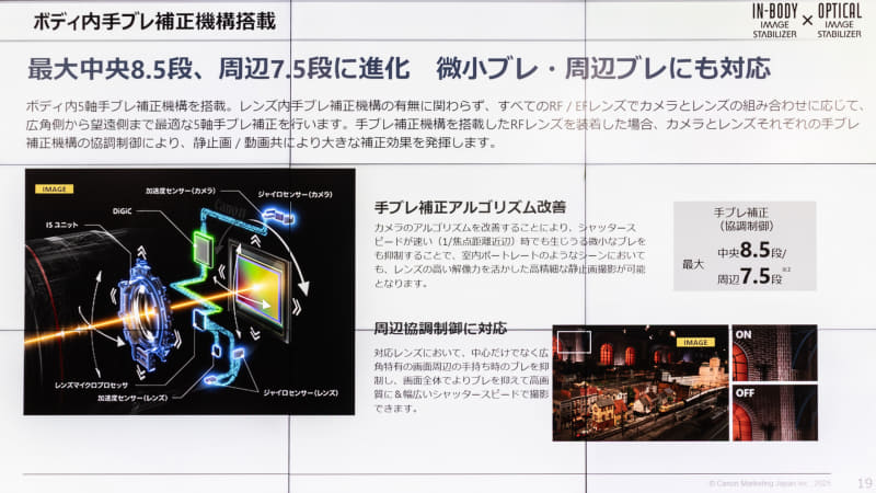 45mmという焦点距離については、すでにRFレンズに50mmが3本あるため、違った焦点距離の提案として決定したという。また、小型化の実現にはプラスチックモールド(PMo)非球面レンズが寄与しているとのことだ。