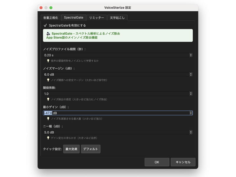 独自開発のノイズ除去機能「SpectralNoiseGate」では、音を周波数成分に分解して帯域ごとにノイズを識別することで、収録音声の補正を行なう。このほか音量を自動で最適化するLUFS正規化、True Peak対応のリミッター、OpenAIの音声認識モデル「Whisper」による文字起こし、複数ファイルのバッチ処理などが行える。ノイズ除去から文字起こしまで、すべての工程をローカル環境で完結でき、外部サーバーとの通信を一切行わない点も特徴の1つとなっている。