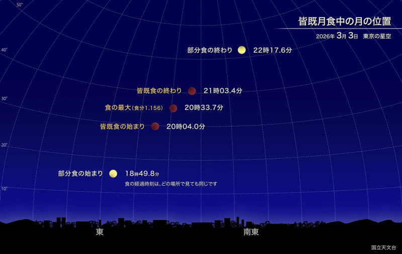 東の空で月が欠け始めるのは18時50分。それから20時33分頃に食の最大となり、22時18分には南東の空で部分食も終わる。“夜ふかしはしないですむ時間帯”に全工程が終わるため、観察しやすい月食になるとしている。