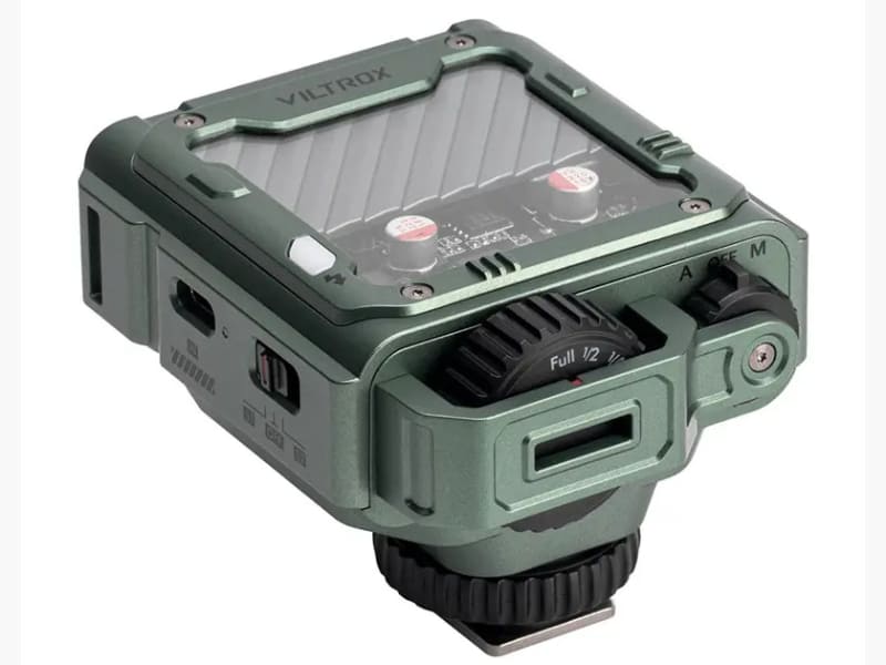 Spark Z3は、Viltroxブランドの小型軽量ストロボ。側面と背面にスイッチ類やダイヤルの操作部を備えている。上面の一部には内部が見えるスケルトン風の外装デザインを採用。カラーリングもガンメタルグレー、ツンドラグリーンの2色から選べるなど個性的だ。