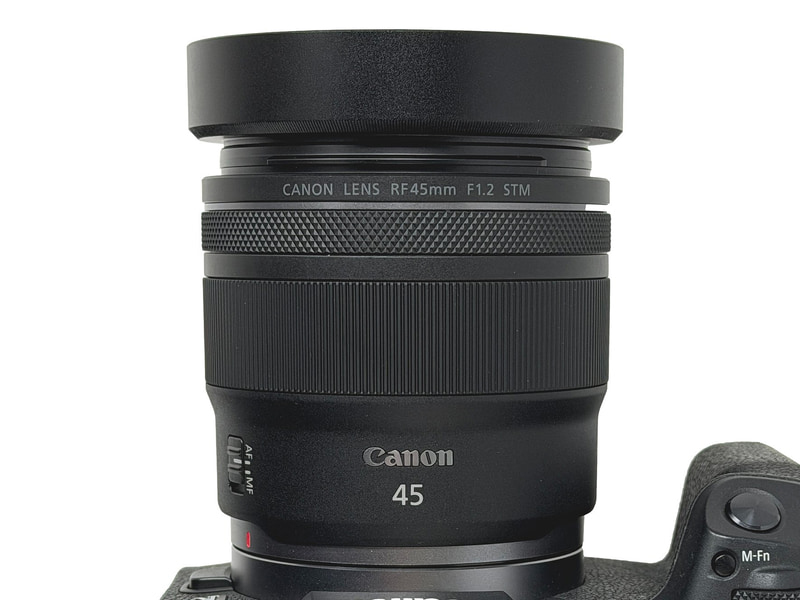 レンズフードが別売のRF45mm F1.2 STMのために用意された。装着時にケラレがないことを確認しているという。現在、キヤノン純正のRF45mm F1.2 STM用レンズフード「ES-73B」は品薄になっている。