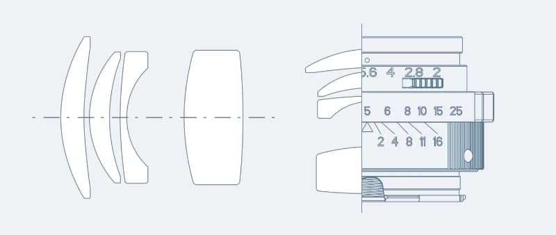 ライツカナダ製ELCAN 50mm F2を再現したとみられる製品で、外観や貼り合わせのない4群4枚構成など、オリジナルレンズの設計思想を忠実に踏襲したという。