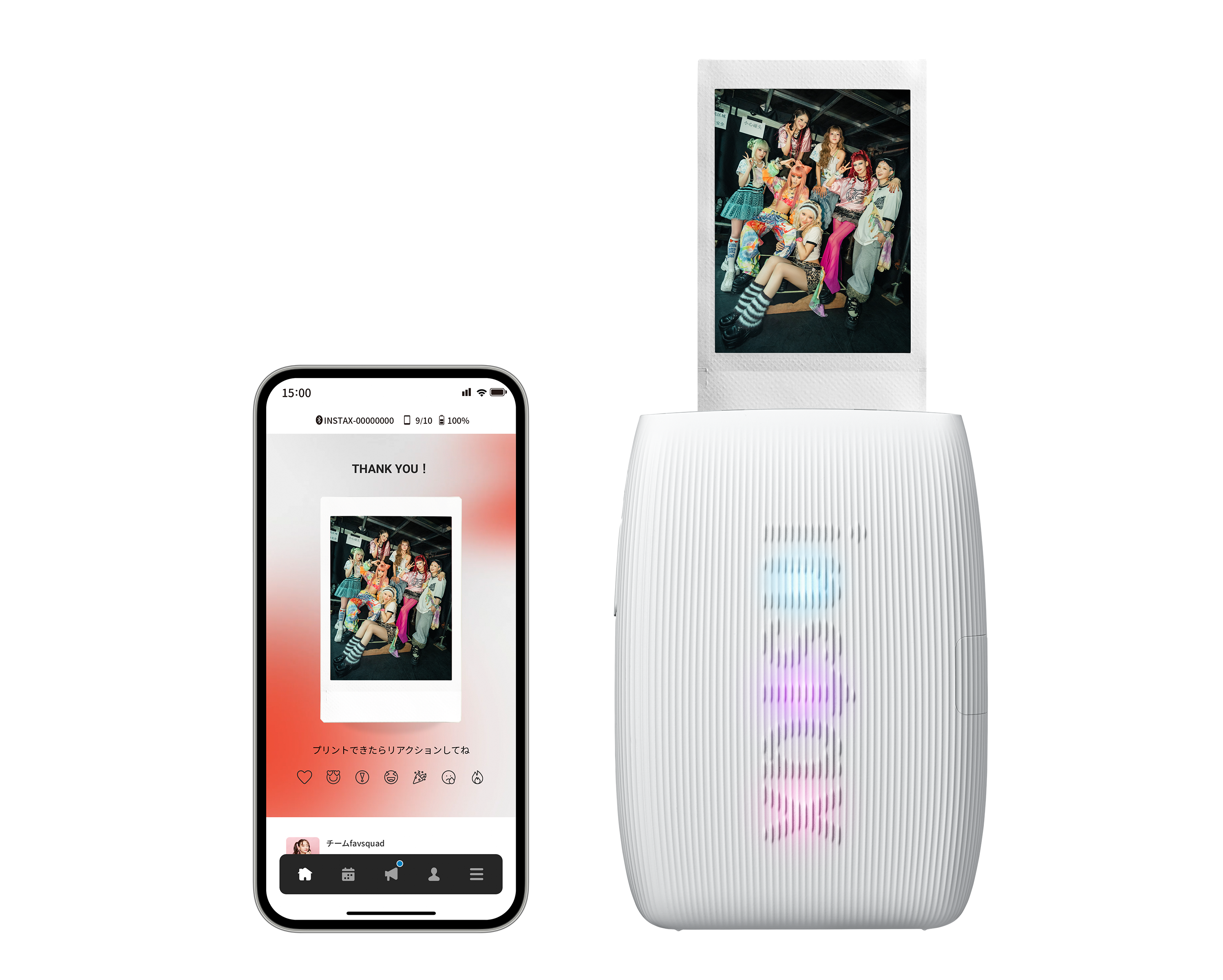 「Favsquad」は、配信されたアーティストの画像をチェキプリントにするためのスマートフォンアプリ。nstaxシリーズのスマートフォンプリンターやハイブリッドインスタントカメラでプリントできる。