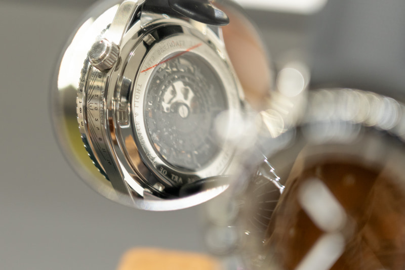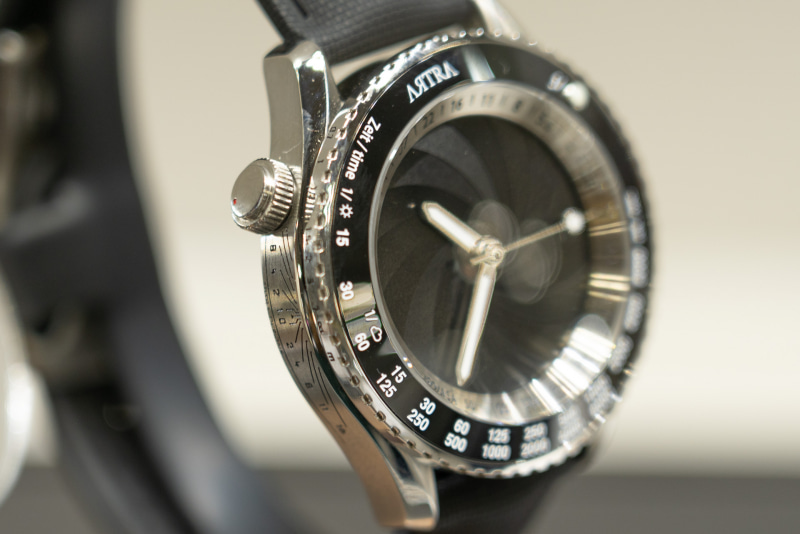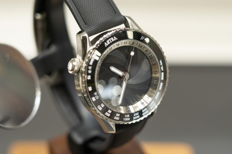カメラをモチーフにしたデザインが特徴。ベゼルがシャッターダイヤル風になっているほか、10時位置のツマミを回すと文字盤の絞り羽根風ギミックが動作する。