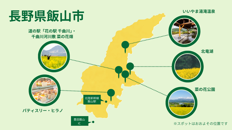 春の訪れとともに「菜の花公園」「北竜湖」「千曲川河川敷」などで菜の花が見られる。市内各所の菜の花スポットに加えて、温泉や買い物、スイーツまでを含めた1日の流れを提案している。