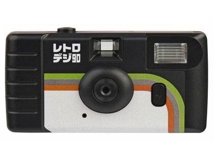レトロデジ90は、有効約32万画素の1/10型CMOSセンサーを搭載したトイデジカメ。外観だけでなく撮影感覚もレンズ付きフィルムに寄せており、背面液晶モニターはなく、シャッターを押す前に親指でダイヤルを回す必要がある。カラーモードは「カラー」「モノクロ」「レトロ」の3種。
