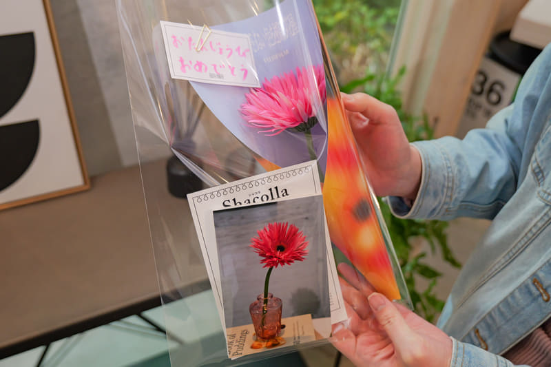 そして自身で選んで撮影した花をラッピング紙に包み、メッセージカードをそこに添えて持ち帰ることができるという流れだ。実際の花と、それを写した写真をセットにするというのがおもしろい。
