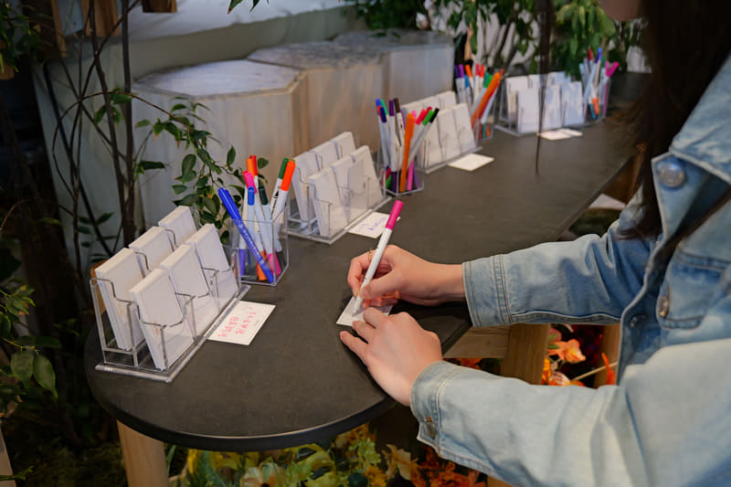 まず最初はメッセージカードへの記入から始まる。大切な人や自分に向けて思いを文字にしたためたら、そのメッセージを添えるための花を1輪えらぶ。