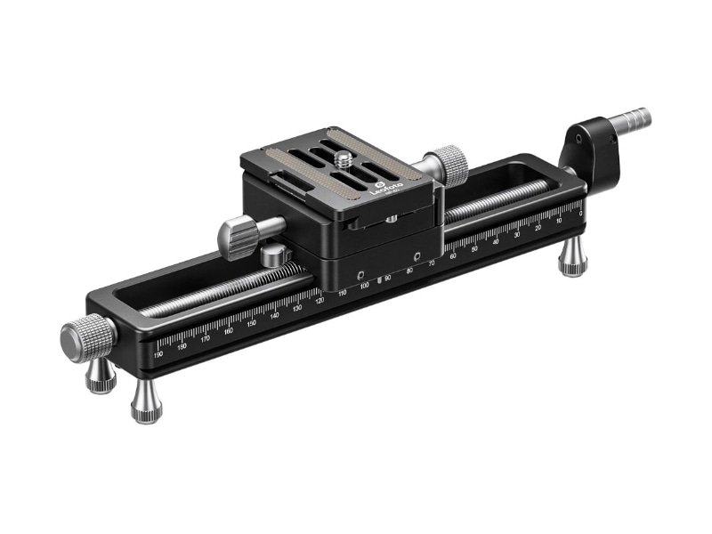 マクロ撮影時に被写体との距離を厳密に調整するための製品。従来モデル「MP-180S」と異なり、前後方向をロックできるようになった。クランクでの微動が基本になるが、ロックを外すことで手動による粗動も可能。
