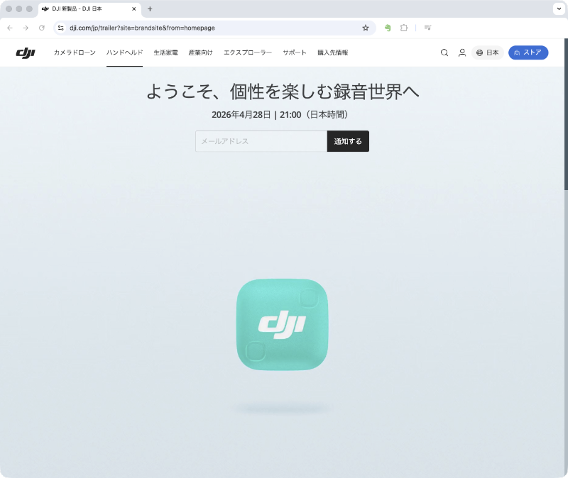 DJIは4月16日(木)、新たなティザー広告を自社サイトで掲出した。発表日は4月28日(火)21時00分と見られ、今回はワイヤレスマイクの新製品のようだ。