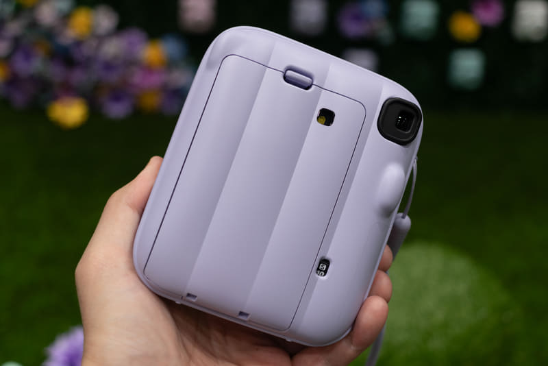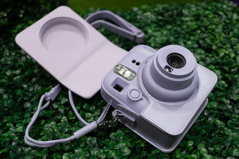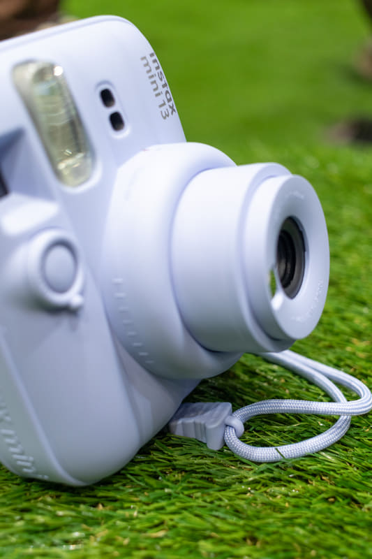 同梱のストラップには「カメラ角度調整アクセサリー」が付いている。instaxロゴのパーツで、置き撮りする際に下部に挟んで角度をつけることができる。そのまま置くと地面や机なども写ってしまうとのことで、セルフタイマーと相性のよいアクセサリーとなっている。