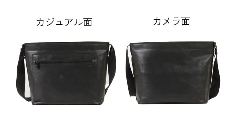 バッグ全体をリバーシブルとすることで、ファスナーポケットを備えた「カジュアル面」と、金具を排した「カメラ面」のどちらかを選んで使用できる。「カメラ面」にすることで、カメラと一緒に肩掛けした際、金具による傷を防げるという。