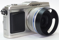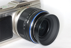 | クラシックメタルレンズフード 37mm P0.75をM.ZUIKO DIGITAL 17mm F2.8に装着したところ | メタルワイドレンズフード 40.5mm(ブラック)をM.ZUIKO DIGITAL ED 14-42mm F3.5-5.6に装着したところ |