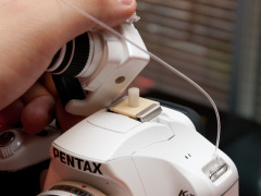 | ホットシューに取り付けられるK-xのミニチュア。価格は200円で全20カラー。発売時期は10月中旬の見込み(発売元は株式会社タカラトミーアーツです) | |