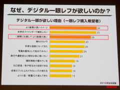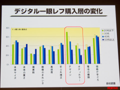 また近年では、デジタル一眼レフカメラ購入者層において、初めて一眼レフカメラを購入するユーザーが増加している傾向があるとの調査結果を示した。20~30代のユーザーに関しては、購入時にデザインやボディカラーを重点項目としているという。