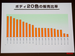 K-xでは2009年10月の発売当初より、20色のボディカラーに5色のグリップを組み合わせた、100色のボディカラー展開を行なっている。井植氏は現時点までの各色の販売比率も開示し、「出荷の幅が思ったより広かった」と振り返る。受注開始当初は、売れるカラーと売れないカラーの差がもっとはっきり出ると予想していたとした。