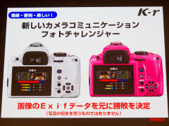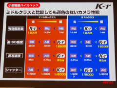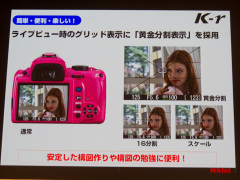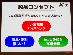 製品コンセプトを「小型軽量ハイスペック」、「簡単・便利・楽しい」、「もっと多彩な写真表現」と紹介し、一眼レフカメラの購入希望者は、より高い画質を求めて購入を検討する傾向が強いという調査結果も提示した。また、iPhoneやiPadからでもK-rの注文が可能なK-rのカラーシミュレーターのデモンストレーションも行なっていた。