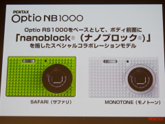 Optio RS1000をベースとした派生商品として、カワダのブロック玩具「nanoblock」(ナノブロック)とのコラボレーションモデル「Optio NB1000」も発表した。グリーンカラーをベースとした「SAFARI」と、白黒を基調とした「MONOTONE」を用意する。