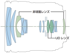 レンズ構成はUDレンズ2枚、非球面レンズ2枚を含む12群15枚。倍率色収差を含む諸収差を抑えたとする。インナーフォーカスを採用した。レンズの外側になる面にはフッ素コーティングを施し、撥水性や撥油性に優れるという。