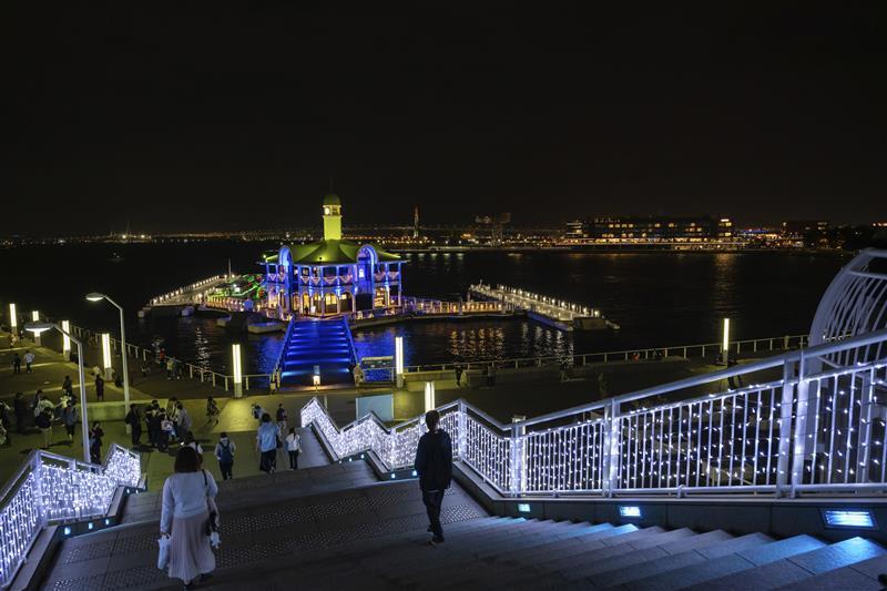 ぷかりさん橋に向かう途中の国立大ホール横大階段も装飾によって光り輝く。その先で海に浮かんでいるぷかりさん橋が幻想的な光に包まれる。