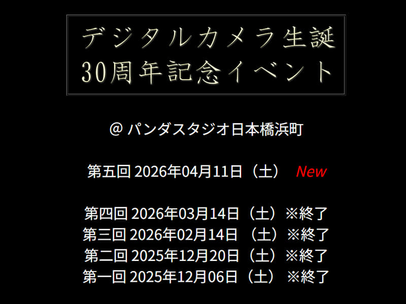 写真家の山田久美夫氏が企画する「デジタルカメラ生誕30周年記念イベント」の第5回が、4月11日(日)にパンダスタジオ日本橋浜町で開催される。参加費は無料。事前申し込み制となる。