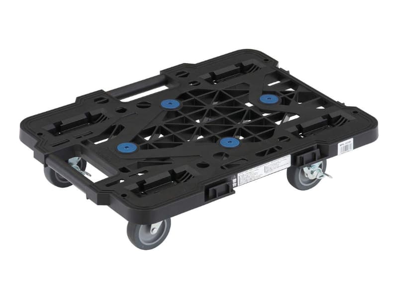 均等荷重が100kgのため、重量のある機材でも安心して楽に運搬できる。4輪すべてにストッパーを備えており、平台車同士の連結にも対応。