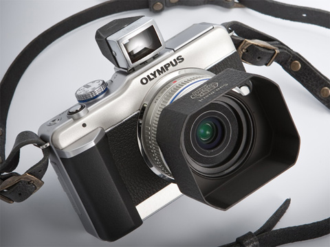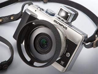 ペンライトE-PL1は、コロンとした四角いカメラだ。昭和期のフィルムコンパクトに似た愛嬌がある。今回は角型フードと角型ファインダーを合わせ、この四角っぽさを活かしたドレスアップを考えてみたい。そしてもうひとつ、このボディ固有のお題目がある。シャンパンゴールドというボディカラーをどう料理するか。シャンパンゴールドであることを意識して、アクセサリー類を選んでみよう。