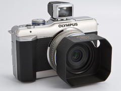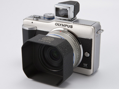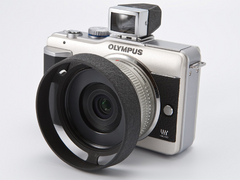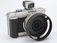 まず、レンズは「M.ZUIKO DIGITAL 17mm F2.8」を選んでみた。レンズ鏡胴とボディのカラーが近く、サイズ感も好相性なレンズだ。E-PL1に付けると35mm判換算34mm相当となるため、ツァイスイコンの35mmファインダーを装着。フードはライツXOONSを選んだ。このフードは「ズマリット50mm F1.5」という標準レンズ用のフードだが、M.ZUIKO DIGITAL 17mm F2.8に付けてケラレなしで使用できる。取り付けはカブセ式で、ここでは37-40.5mmステップアップリングの上からかぶせている。
