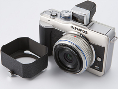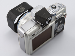 ライツ「XOONS」というフードは、ライカ用フードのなかでも値が張る方だ。年季の入った並品クラスでも1万円後半から2万円ほど。良品ともなれば3万円近い値段になる。そこでセカンドプランとして、コシナ「LH-3」を用いたドレスアップも紹介しておこう。LH-3は「ノクトン35mm F1.2 アスフェリカル」用のフードで、純正オプションだから単体購入が可能。実売1万円程度なのでXOONSよりは手を出しやすいはずだ。縮緬塗装を施した大振りの三穴フードで、E-PL1とのサイズ感は上々だ。