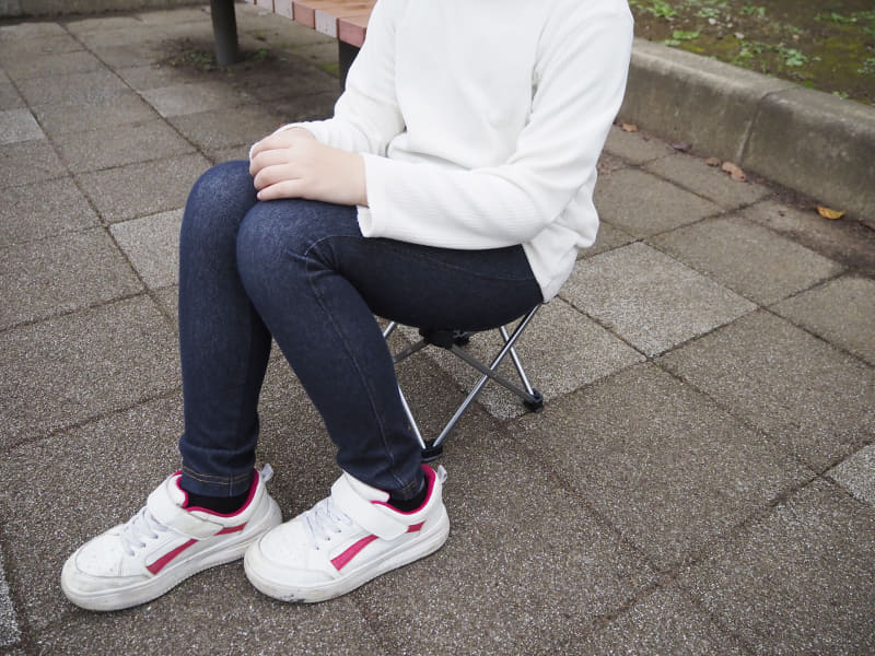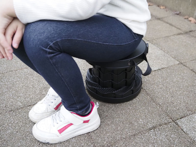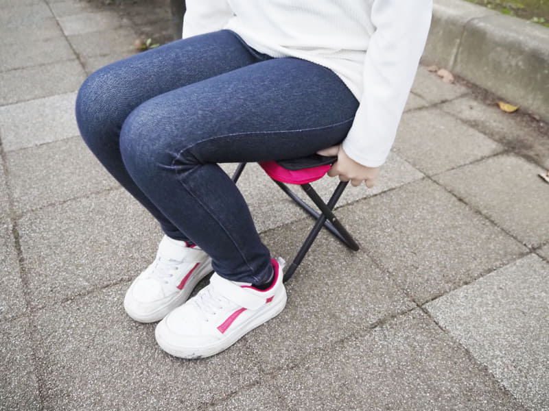 耐荷重は100kgとこちらも必要十分。重さも300gと軽く携帯するには悪くない。ただ、座面高は26.5cmなので、長時間座るなら腰や膝への負担を考えたい。娘が座ってちょうど良いサイズだった。