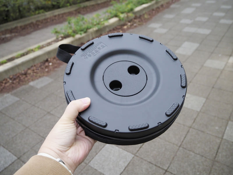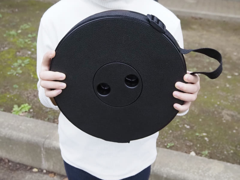 直径25cm・高さ6.5cmの円形状で、座面と底面のくぼみに指を掛け、ひねりながら引っ張ることで展開。また、ひねりながら押し込むと収納できる。