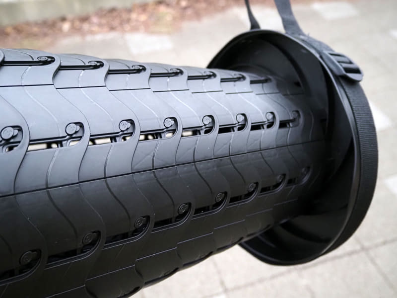 ケースへの収納時は、パイプ自体を引っ張ってひねる(クロスさせる)ことで畳むことが可能。収納にコツがいるものの、慣れればすぐに展開・収納が行えるだろう。
