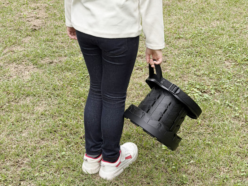 個人的には、子供を座らせるためのアイテムとしてちょうど良い気がした。仮に急いで撤収しなければならないシーンであっても、すぐに収納でき、持ち運べるので疲れやすい子供と移動する場合に重宝しそうだ。