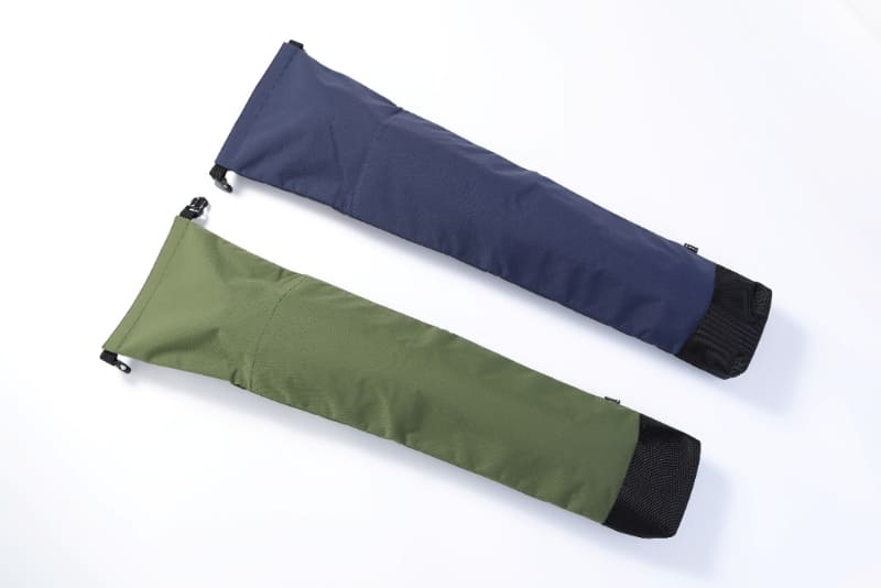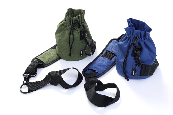 同じく新製品の三脚ポシェットは、三脚の脚部にかぶせて巾着で締め、付属ベルトで三脚本体に固定するだけというシンプルなアイテムだ。カラーはオレンジ、グリーン、サンド、ダークグレー、ネイビーブルー。