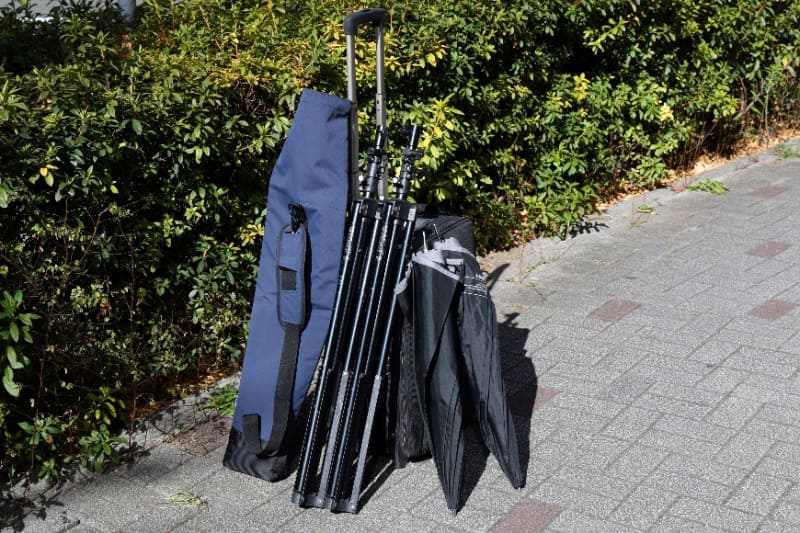 また仕様上の最大収納長を超える90cmのライトスタンドを試したところ、開口部のロールはできないものの、バックル止めのみで問題なく携行でき、同時にアンブレラ2個を収める余裕もあった。