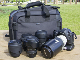 | バッテリーグリップを装着したEOS 5D Mark IIIに標準ズームレンズを装着、70-200mm F2.8ズームを含めたレンズ4本収納。 | バッテリーグリップを装着したEOS 5D Mark IIIに70-200mm F2.8ズームを装着したまま収納。ほかにズームレンズ2本収納。望遠ズームと内壁の隙間は付属のクッションで埋めている。 |