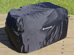 | バッグ上面にはIDカードスロットがある。名刺などを入れておくとよいだろう。ちなみに私はご覧のような顔写真付きIDカードをいつも入れている。結構目立つので防犯面でもオススメ。 | 付属のレインカバーを装着したところ。ショルダーストラップを取り付けるD環もカバーから出せるので雨中での行動でも制限は少ない。 |