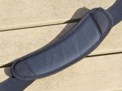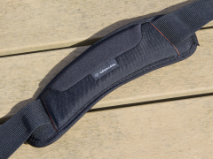 | 付属のショルダーストラップには厚手の肩当てが付属。適度な曲面で肩の形状にも馴染む。 | |