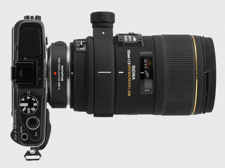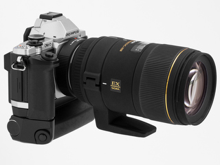 | シグマのAPO Macro 150mm F2.8 EX DG HSMをE-P3に取り付けたところ。見た目からしてバランスがよろしくない。 |