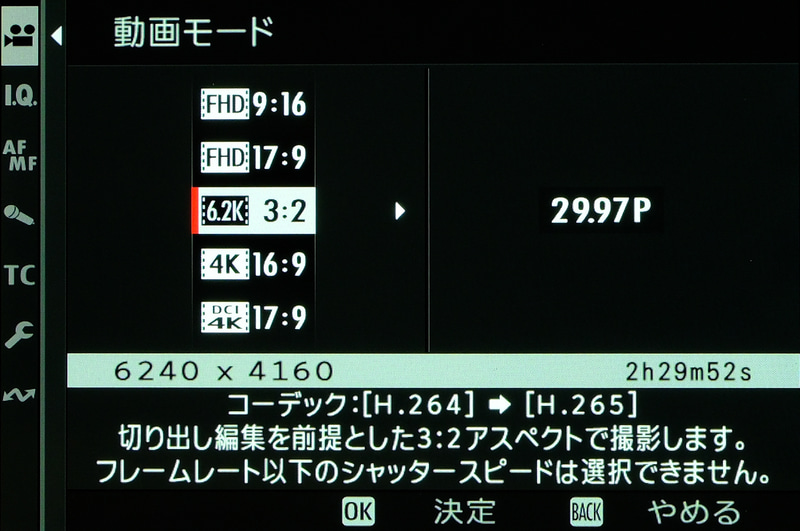 最大で6.2K 30P(4:2:2 10bit)の動画記録に対応している。一般的な用途であれば十分すぎる性能であり、エントリーモデルとしてはかなり優秀な動画機能を備えていると言えるだろう。