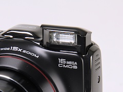 上面にあるON/OFF(電源)ボタンを押すと、かなり素早く起動する。と同時に、内蔵ストロボが自動的にポップアップする。そう、発光モードの設定とは関係なしに。ボク個人としては、常にポップアップする仕様はあまり好きではないが、実用的にはさほど問題はない。ポップアップしたストロボは、指で押さえると容易に引っ込むのだが、ストロボを発光させないのなら、その状態でも撮影できるのだ。