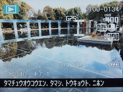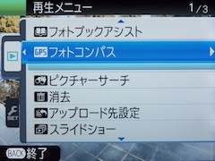 | 位置情報が記録された画像は、再生時に画面の上の方に「GPS」と表示される。また、画面下部には緯度経度や地名表示が表示される(セットアップメニューの位置情報表示の設定による) | |