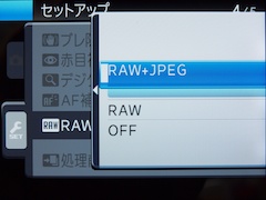 | 上級機らしく、RAWおよびRAW+JPEGでの撮影が可能。ただし、RAWとJPEGで設定が別の画面になっている点が気になった |